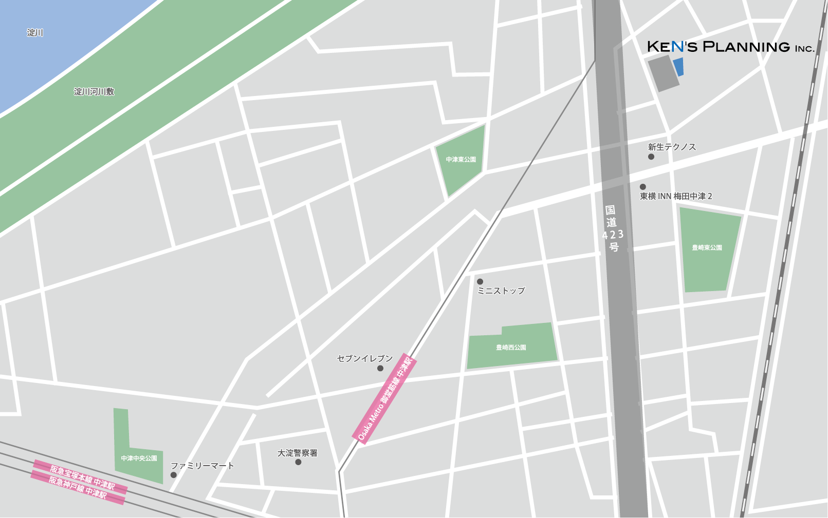 - ・ Osaka Metro 御堂筋線 「中津駅」1番出口より徒歩8分